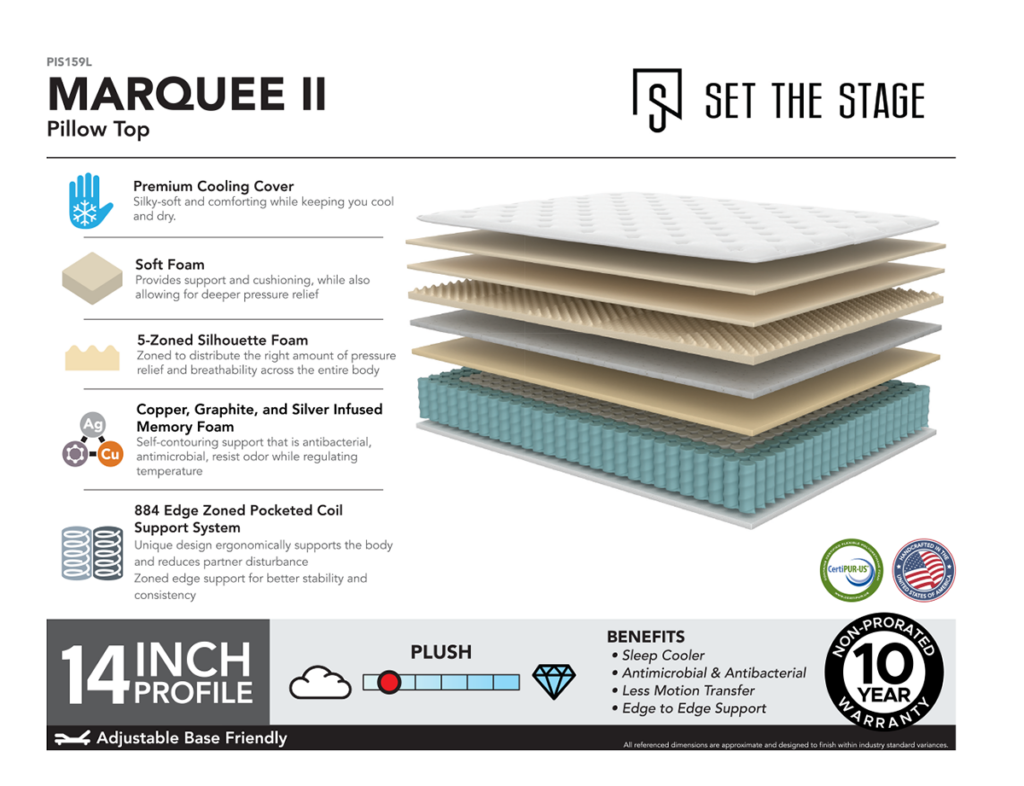 For those who want maximum plushness without sacrificing structure, the Marquee II Pillow Top Mattress delivers luxurious comfort with advanced zoning and coil support. The pillow top adds an extra layer of softness while maintaining breathability, stability, and durability.
