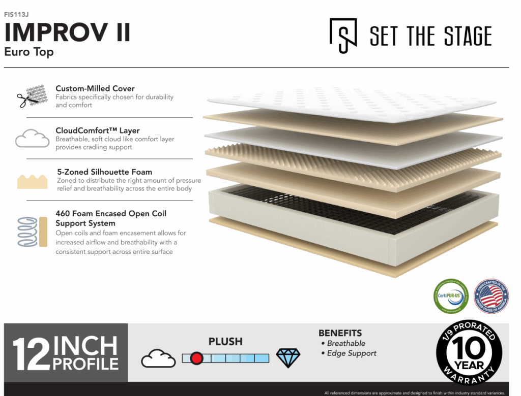 The Improv II Euro Top is a plush, breathable mattress designed for sleepers who love a soft, cradling feel without losing supportive structure. Custom-made for Set the Stage by Corsicana Mattress, this 12" profile mattress blends cloud-like comfort with dependable, full-surface support for truly restorative sleep.