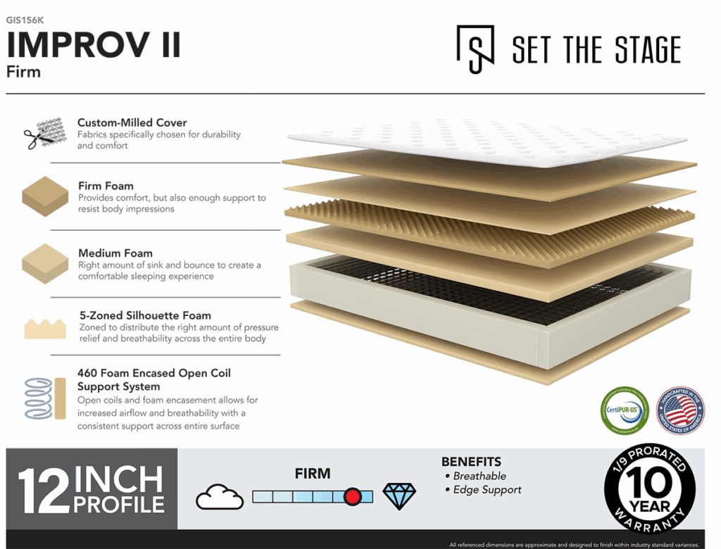 The Improv II Firm is designed for sleepers who prefer a stable, supportive feel with minimal sink. Custom-made for Set the Stage by Corsicana Mattress, this 12" profile mattress delivers consistent, no-nonsense support that promotes proper alignment and long-term comfort night after night.