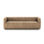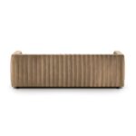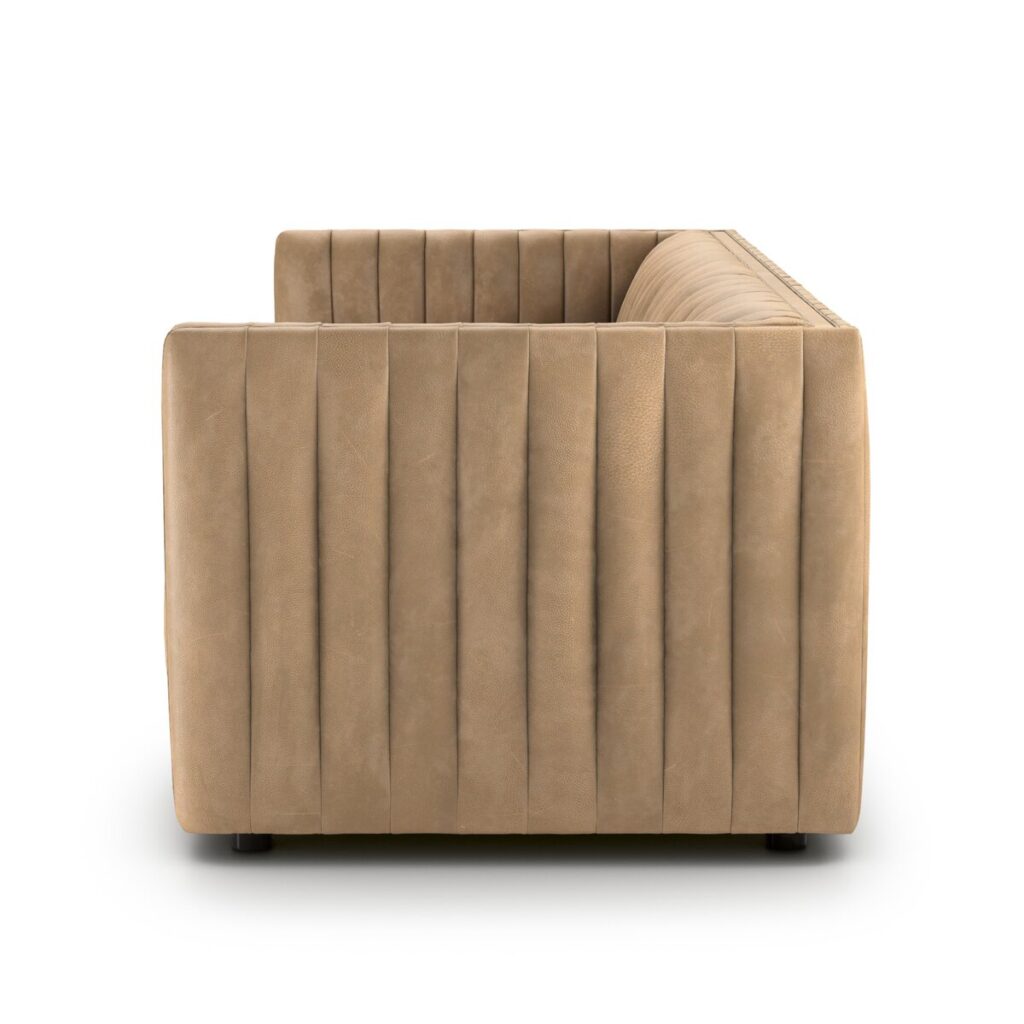 Refined yet inviting, this contemporary leather sofa makes a confident style statement without sacrificing comfort. Dramatic vertical channel tufting across the back and seat adds tailored sophistication, while clean track arms and a low, modern profile create a streamlined silhouette perfect for today’s living spaces.